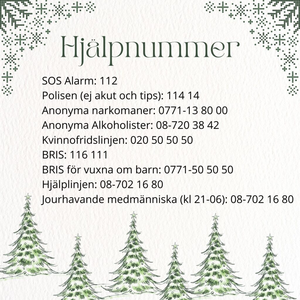 Julen är inte alltid en lätt tid, så på bild 2 finns det hjälpnummer. Det går också att få hjälp hos Droghjälpen och Alkoholhjälpen.